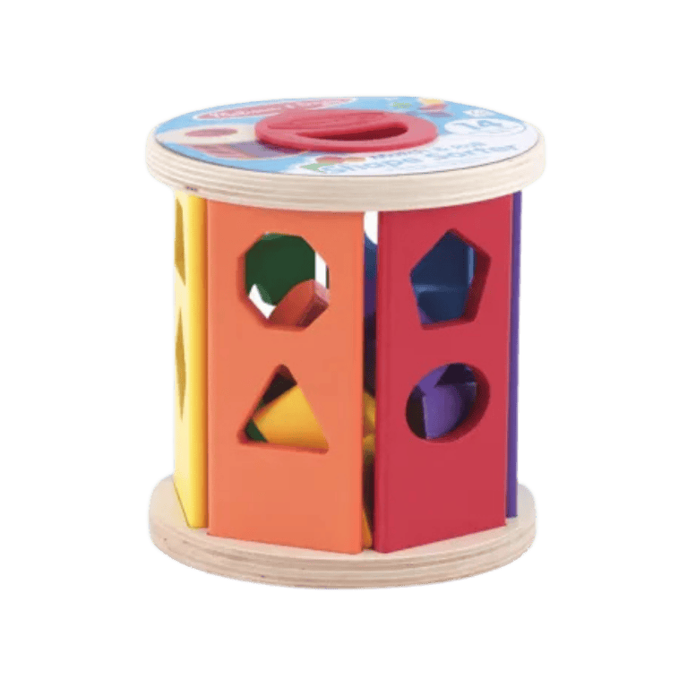 Interactive wooden shape sorter that builds problem-solving skills, hand-eye coordination, and shape recognition.